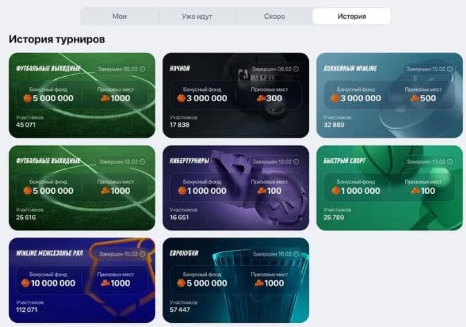 После подтверждения участия на странице с турнирами «Винлайн» появятся четыре вкладки: