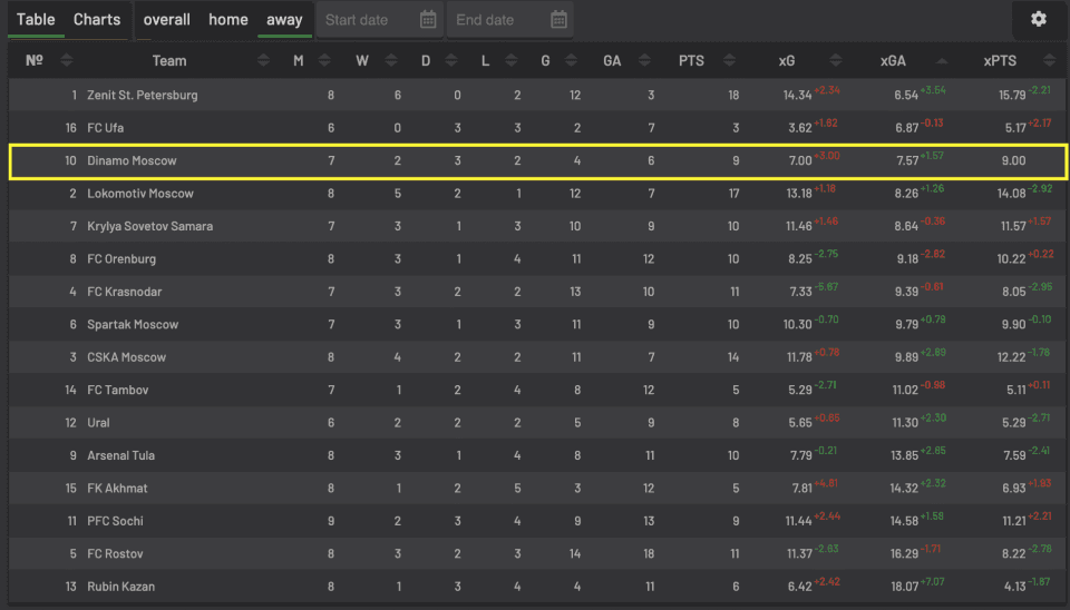 Интересно, что «Динамо» является третьей командой лиги по допущенным моментам у своих ворот на выезде - 7.57 xGa. Меньше только у «Зенита» и «Уфы». «Динамо» умеет разрушать.