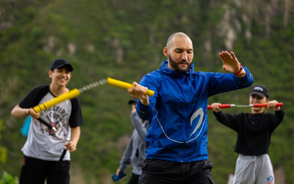 После небольшой разминки экспедиция приступила к покорению “лестницы здоровья”, все 842 ступеньки до плотины, где спортсмены смогли перевести дух и насладиться видами. Далее подъем до Горельника на специально отведенное место, где Давлетчин провел два увлекательных мастер-класса по растяжке и владению нунчаками.